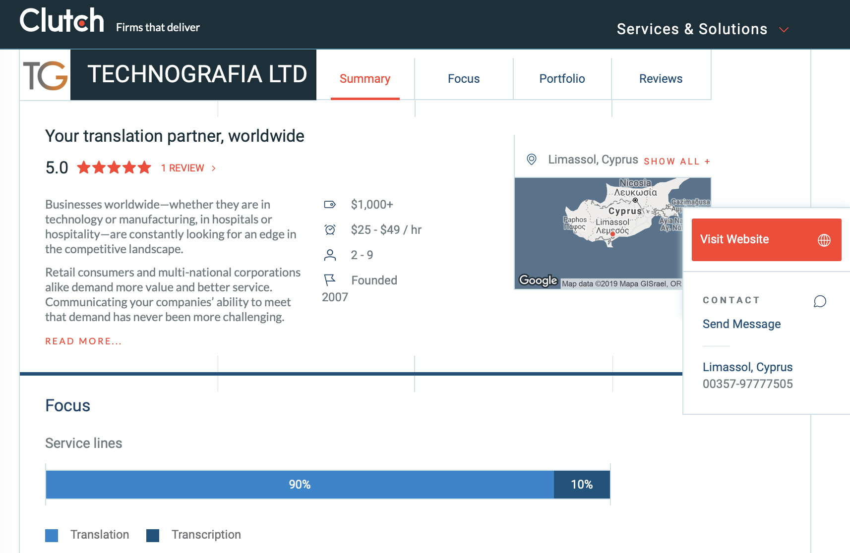 Companies across different industries require translation and transcription services and Clutch’s sister sites help prospective buyers find companies like TECHNOGRAFIA LTD. Our team is recognized for customer service on The Manifest. This site helps the buying process, so prospective clients can get to know us before they even pick up the phone.